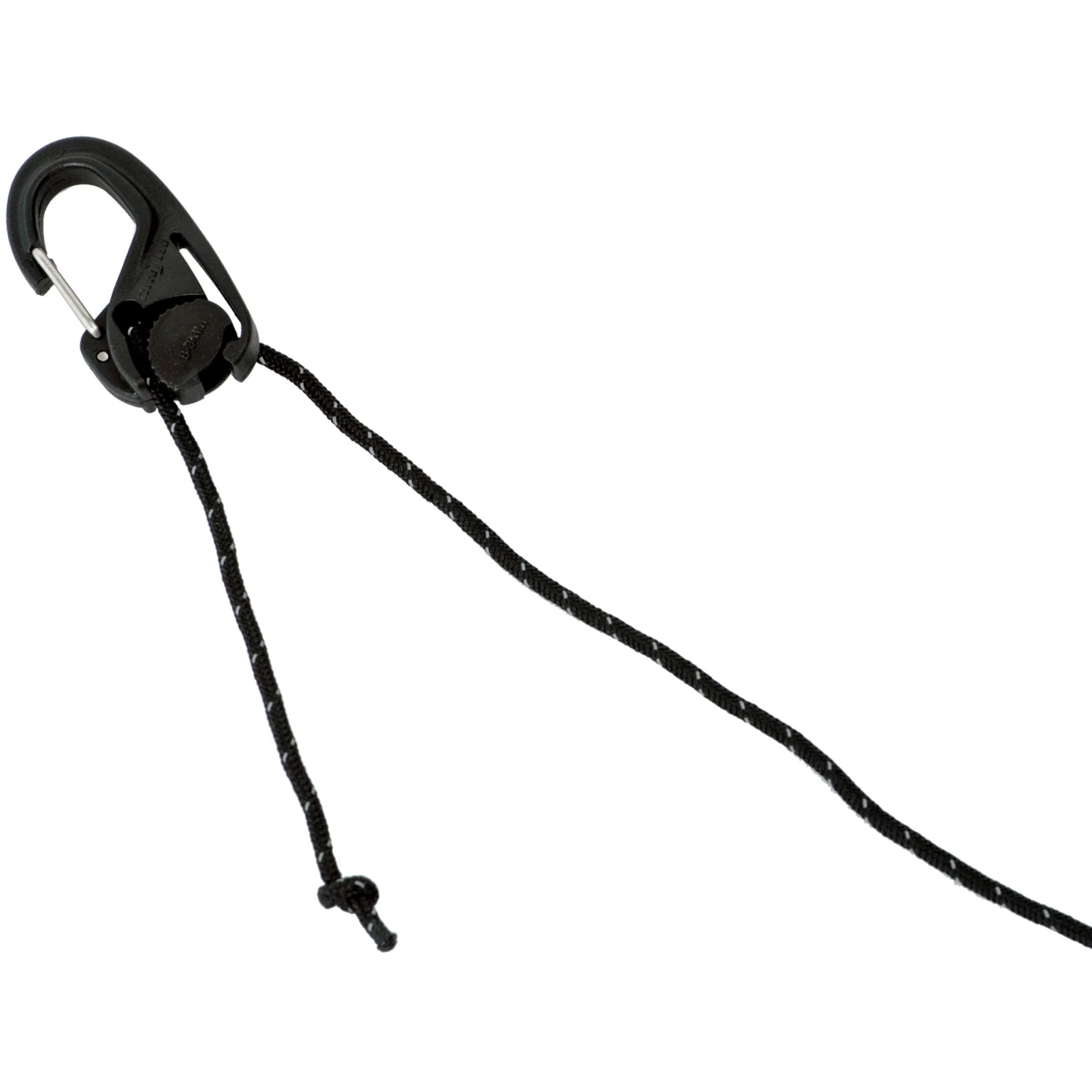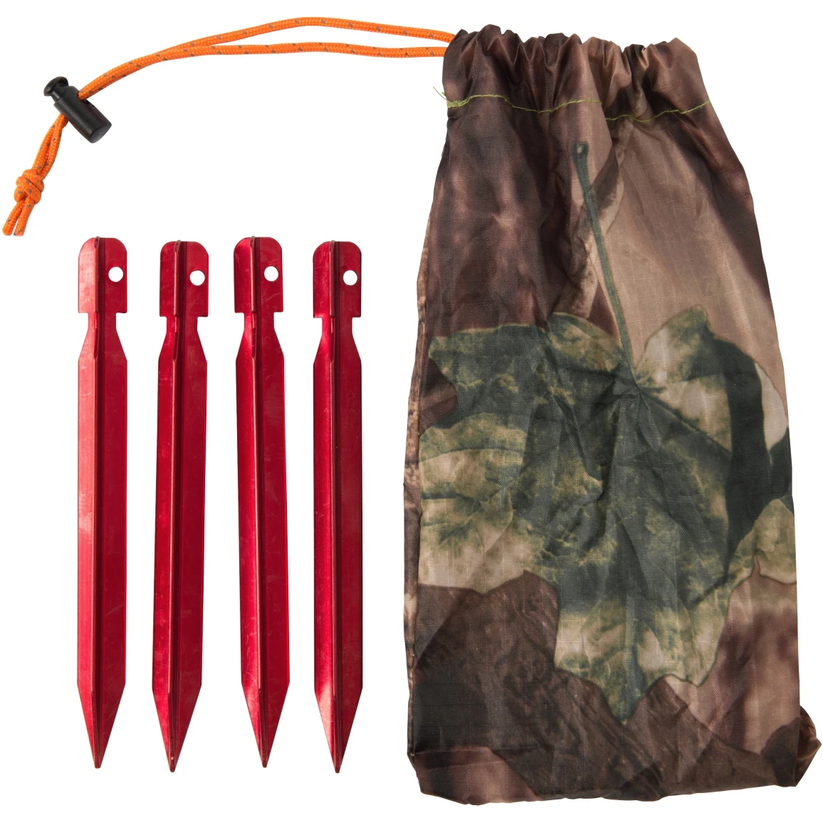 Tarp with 4 Y-pegs, fastening ropes with adjustment carabiner and packing bag.