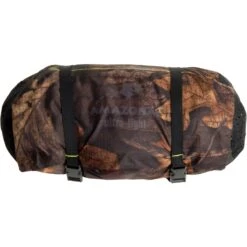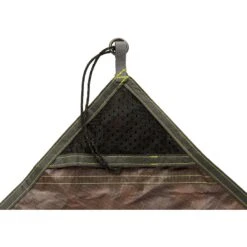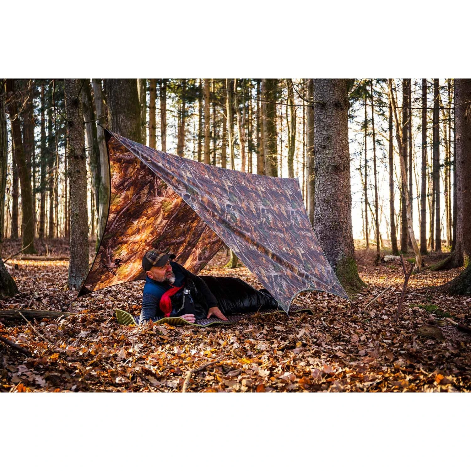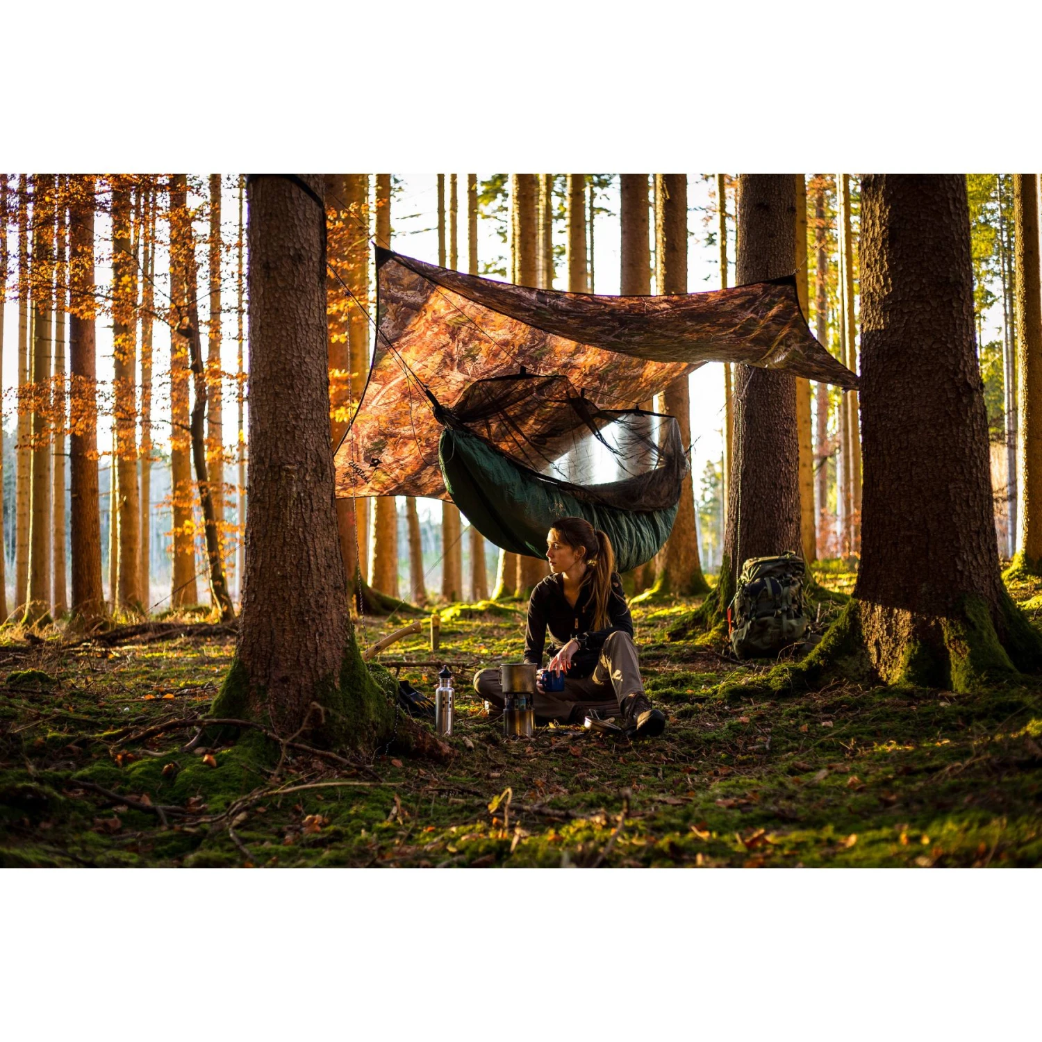 The tarp is exactly adapted to ultra-light hammock dimensions. This turns the hammock into an outdoor bed. The tarp is hung and braced at the hammock’s attachment points. The trapezoidal cut of the tarp allows enough air to circulate and still protects from rain, sun and falling leaves. All guy points are equipped with small pockets for the lines. For optimal camouflage in almost all seasons: The forest look combines a pattern of leaves, trees and the typical colors of the forest. Thus, the tarp blends inconspicuously into the background and optical silhouettes blur.