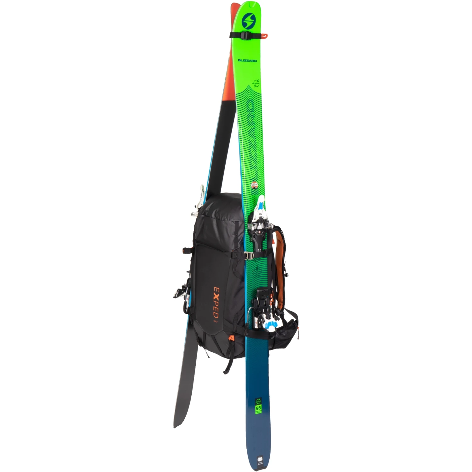 Skis and splitboard can be easily tied on in three different ways. The included webbing straps with lockable buckles also allow snowboards and snowshoes to be attached vertically to the front of the pack. All pockets and compartments are easily accessible even when wearing gloves. In addition, the material loops can be removed. The two different pick attachments can also be positioned freely.