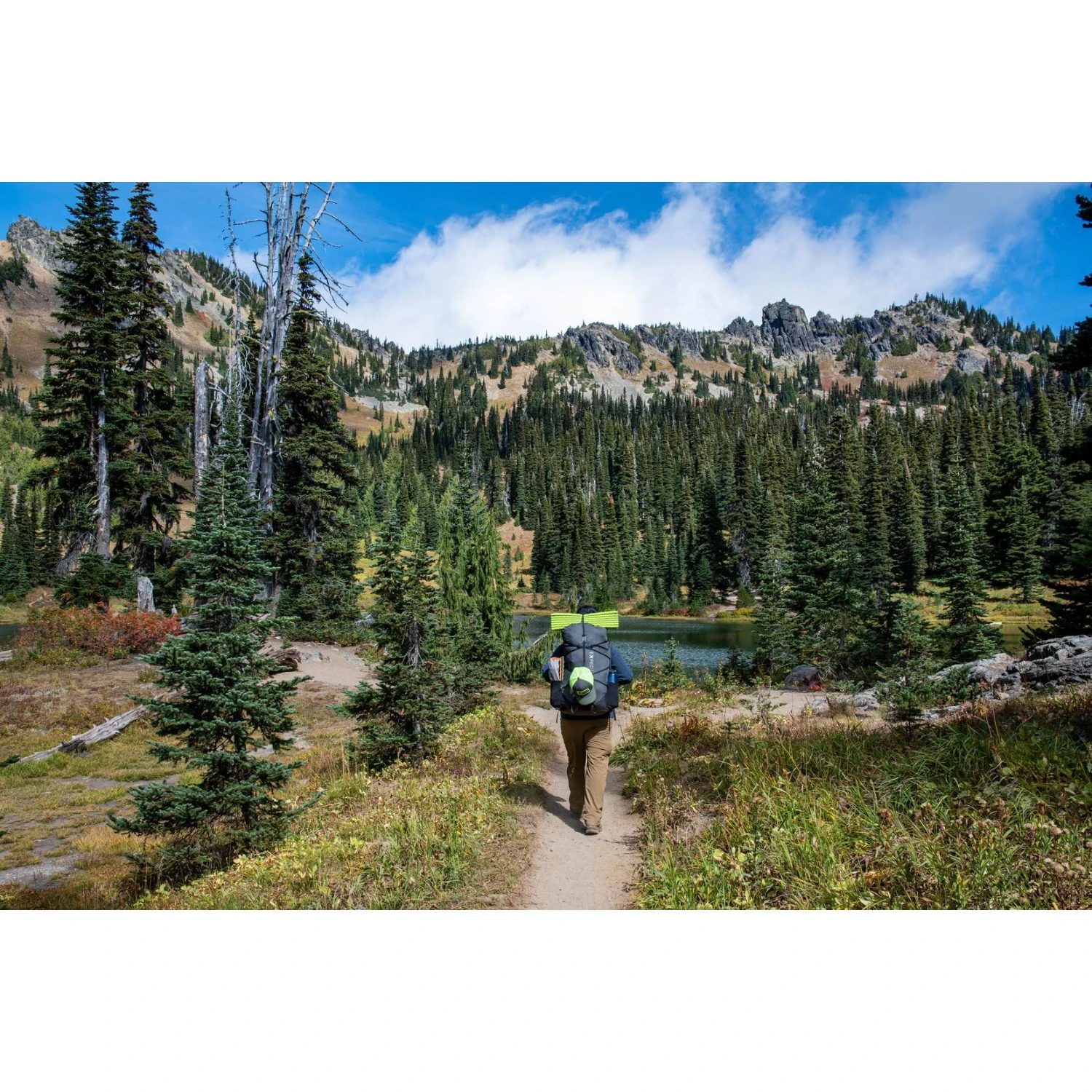 The fully adjustable carrying system with minimal contact points and aluminum bar is height adjustable and can be easily adjusted to fit your back length. A padded hip belt provides further carrying comfort. The extremely lightweight material is water repellent and PFC-free.