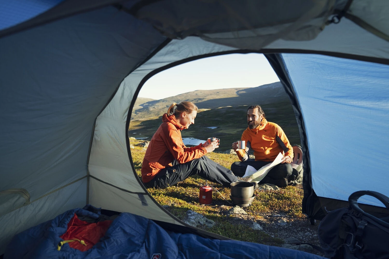 The two-entrance design allows you to use the entrance on the downwind side during storms. A removable mesh shelf on the inner tent ceiling creates practical storage space for gear. Large vents at various heights provide excellent, individually variable ventilation options. All openings are covered with fine mesh and can also be closed from the outside with tent material, which prevents snow or sand from entering. In warm weather, the doors can be fixed half-open to maximize air circulation without letting rain into the inner tent – an auto-stop feature prevents wind from pushing the zipper open. Mosquito netting on the flysheet doors keeps the vestibule free of most insects – a detail that’s as useful on summer trips in Scandinavia as it is in the tropics. The fly is made from Fjällräven’s new high-performance TripleRip nylon. An innovative construction of two different fabric strengths ensures optimum robustness: 40-denier on top and 70-denier reinforcements on the more heavily used tent floor. Just like all other Fjällräven tents, Keb Dome 2 is made entirely without PVC and toxic flame retardants. The impregnation is fluorocarbon-free.