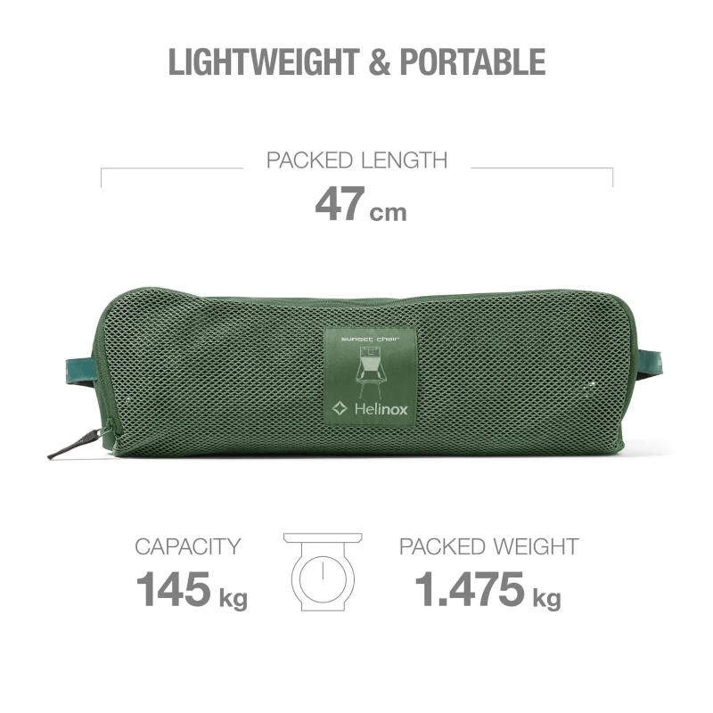 Whether for camping, music festivals, chilling in the park or on a rooftop terrace in the city, the Sunset was designed with a minimalist approach for maximum comfort. At the core of its design, the chair is based on Helinox’s expertise in materials, construction, comfort and style. For better support, it’s designed with a higher backrest and a DAC aluminum frame with longer legs so you have a higher seat height. The frame is strong, lightweight and relies on a shock cord system that makes setup faster and easier. The seat’s ventilated 600D polyester material provides breathable performance on hot days, and the streamlined carry bag converts into a pillow.