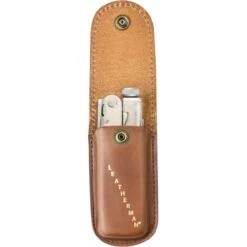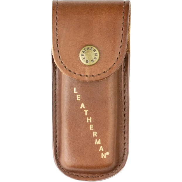 The high-quality holster is made of durable, long-lasting leather. The snap closure and front feature Leatherman lettering.