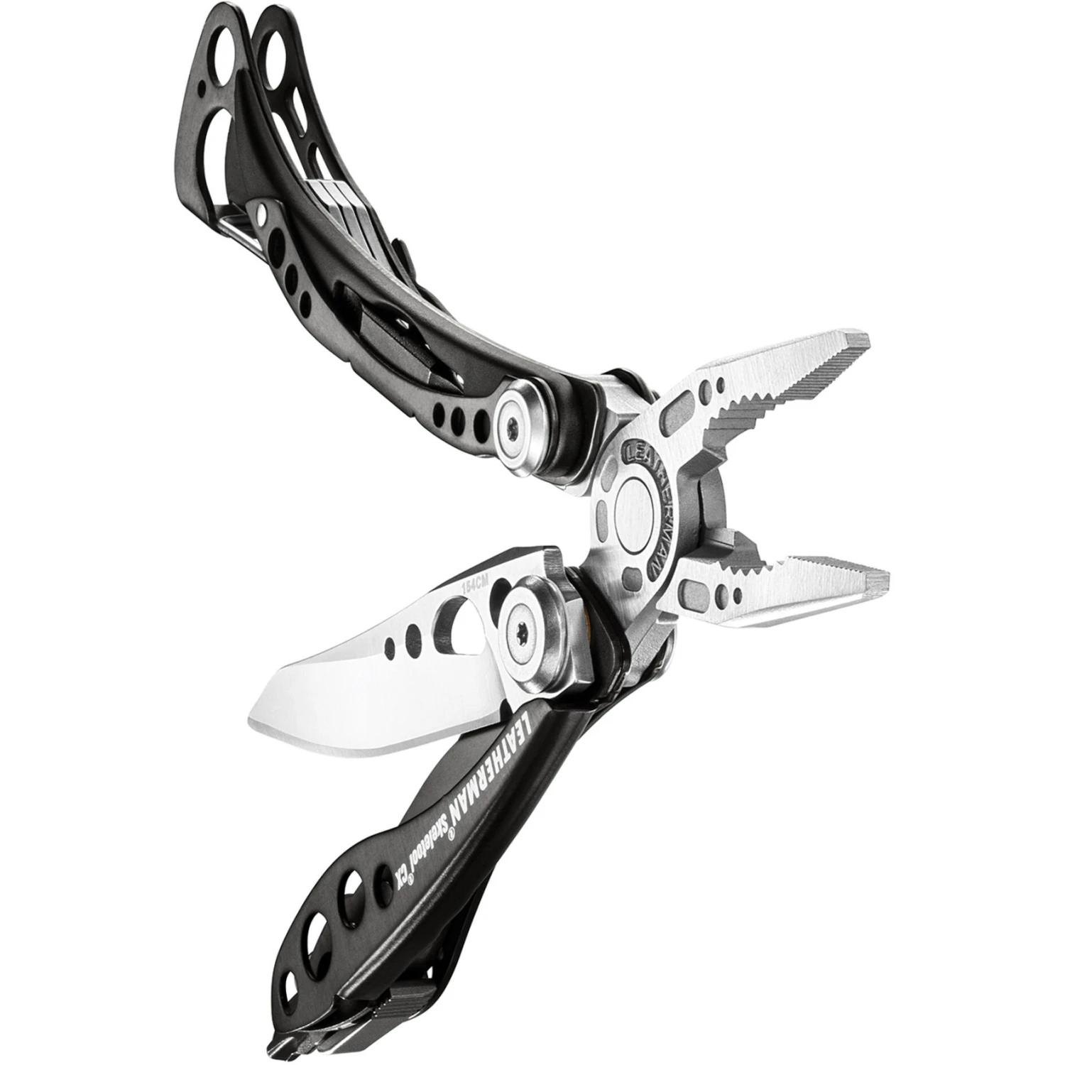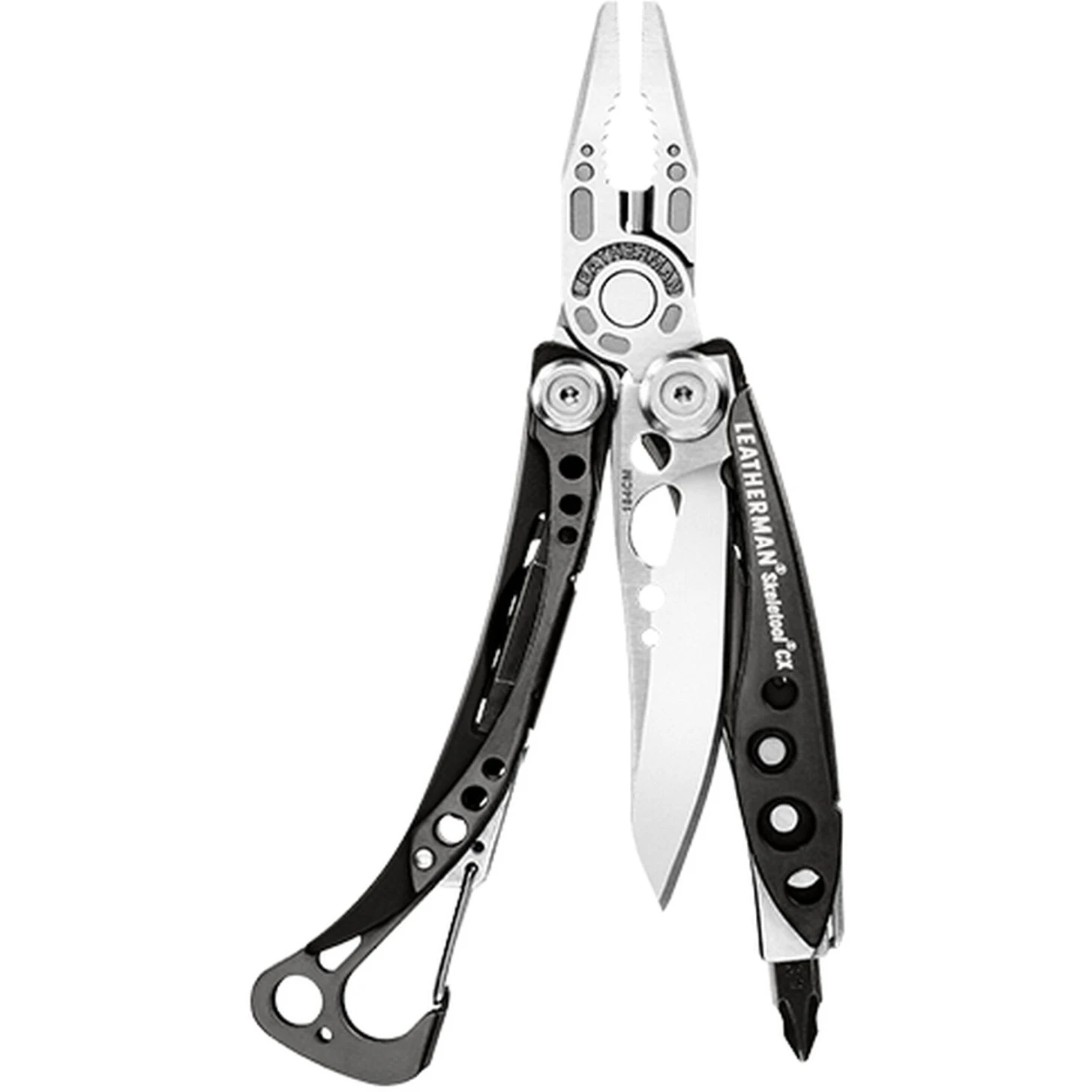The Leatherman Skeletool CX focuses on the essentials …and looks so cool doing it. The Skeletool CX is limited to the most important multi-tool functions, because sometimes you just don’t need more. A 154CM stainless steel blade, pliers, bit holder, attachment clip and carabiner/cap lifter. That’s it. And that means less weight, less bulk, just the right size.