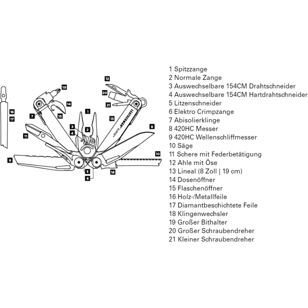 The is a versatile 21-in-1 multi-tool. A true powerhouse equipped with large pliers, long multi-tool blades and easy-to-use latches. A unique blade changer, replaceable high-quality wire cutters and four externally opening blades allow quick access to the tools you use most often. The Surge is just the right tool for complicated tasks and for the hands that need to get them done.