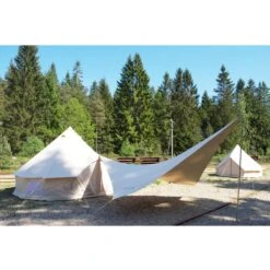 The is shaped differently than a classic rectangular tarp, but offers a diamond-shaped design that matches the entrance of Nordisk Legacy tents, especially the Asgard series. If you attach this tarp to the entrance of Asgard, it provides additional space and protection against strong sunlight and against rain – and if you use it as a storage space for larger pieces of luggage, empty backpacks and dirty shoes, you also improve the sleeping climate inside the tent. If there is a possibility to attach the Kari Diamond Tarp to a tree or similar, it can also be used separately – or you can use the included poles, pegs and guy line to set it up as well.