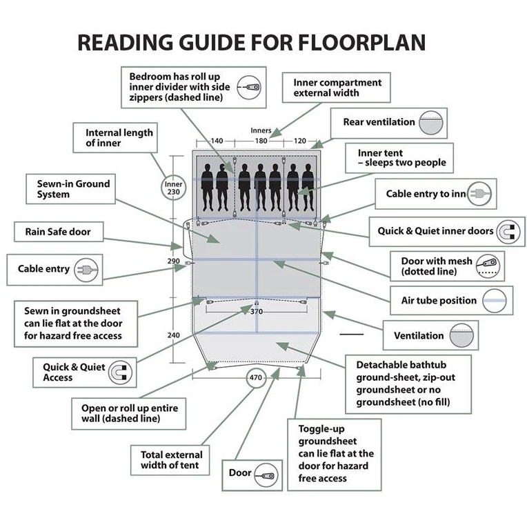 - Link Access Zone System tent floor with integrated floor skirt Large canopy provides protection from rain and glaring sunlight
