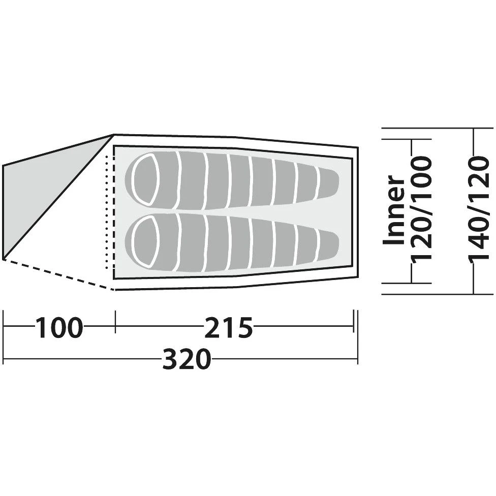 The Buck Creek 2 sleeps two in a sloping tunnel design with enough head room to sit in the inner close to its door. The tent clips onto an external frame that has a ridge pole to extend the porch area for the additional storage required for two. The porch has a partial groundsheet to protect content while providing ‘wet’ access where boots can be left. Entry to the tent is via a side door that folds to one side. This features a double zip so the door can be cracked open at the top for additional ventilation.Â