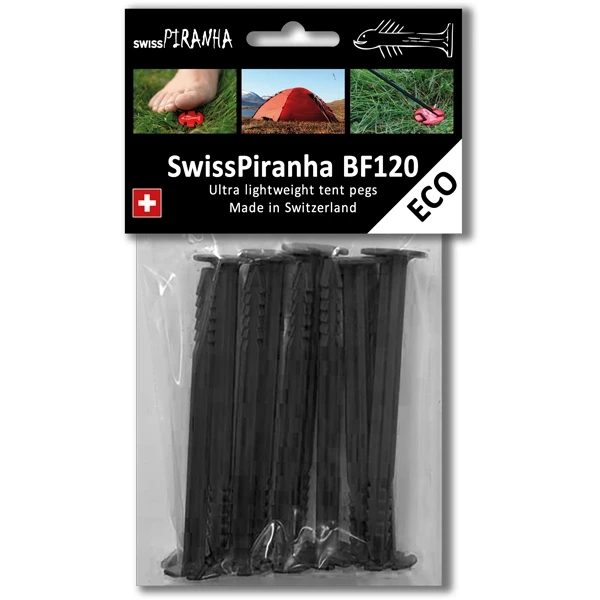 The SwissPiranha BF120 is the environmentally friendly and lighter version of the popular RT150. This peg is made of 100% recycled plastic and convinces with a low weight of only 6g at 12cm length. This makes it especially interesting for longer tents with many guy points!