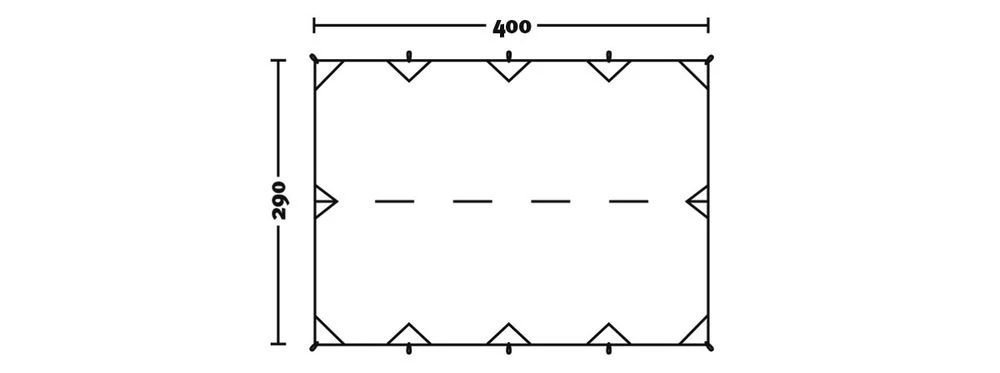 The with the sizes 290 x 400 cm is a 11,6m² rectangular flysheet for multiple applications. The diverse setup options make it practical for a wide variety of usages: as an additional roof or as a substitute tent. It can be fastened to trees or stakes or set up with additional tent poles (not included) to be used on its own.
