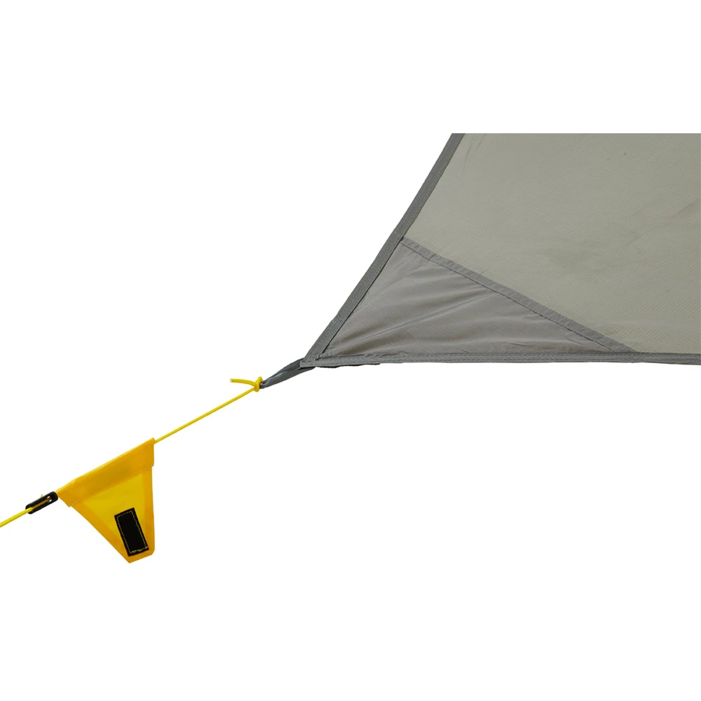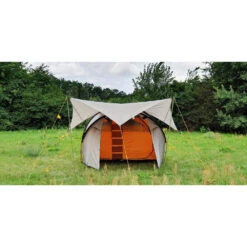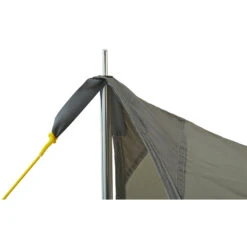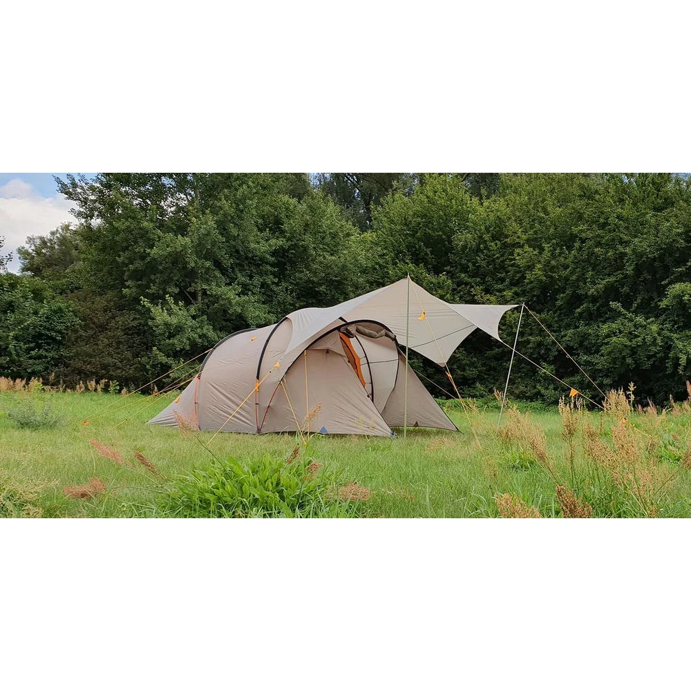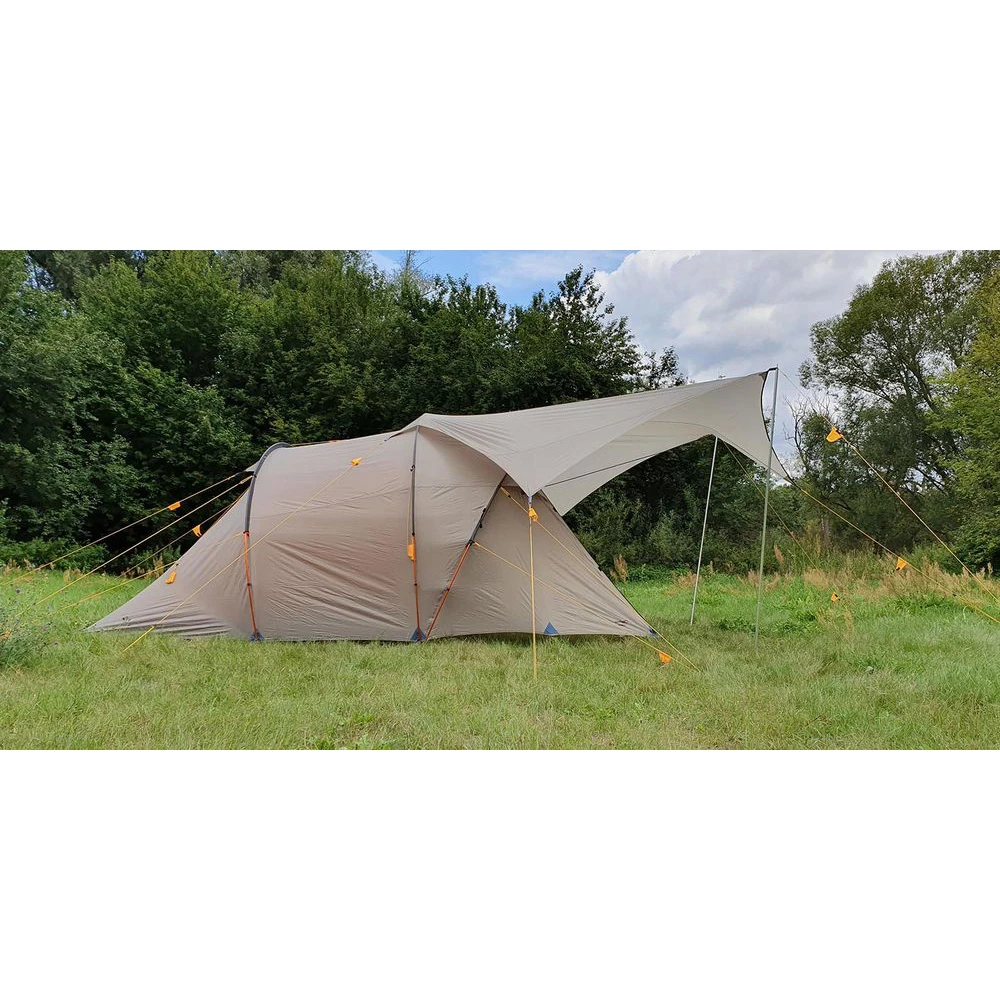 is a universal tent roof with minimal surface cut. It can be combined with most tents to obtain a weather-protected entrance area. It can also be used solo set up as an ultralight weather shelter. Reinforced guy loops and guy lines with line tensioners make the Wing very stable.