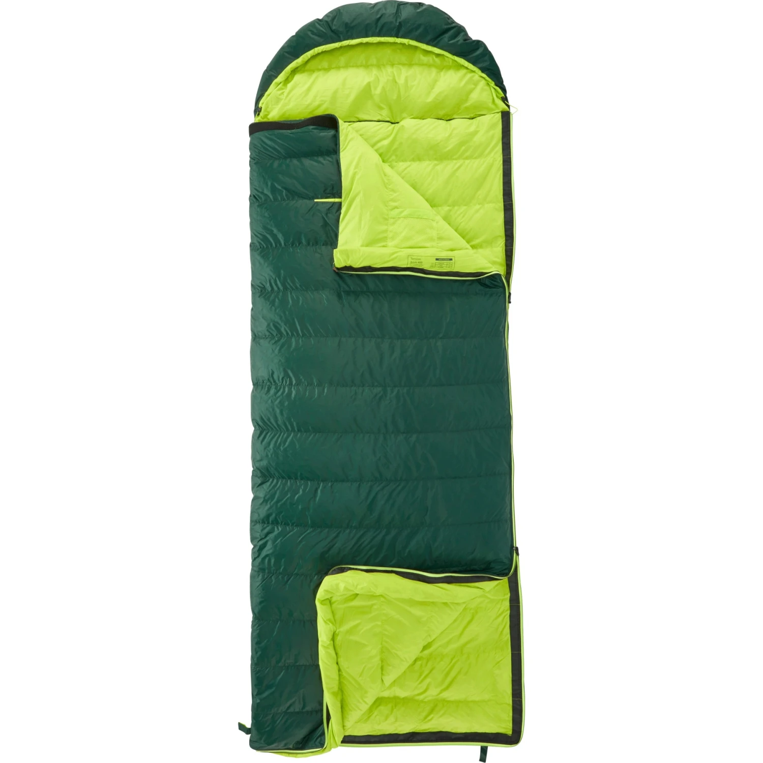 The Tension Brick 400 is a medium-light, roomy and comfortable down sleeping bag that offers full protection from the cold. Choose this rectangular shaped sleeping bag if you prefer roomy comfort at night with enough legroom and freedom of movement. The technical and removable hood can be used on both sides and the sleeping bag can be quickly and easily combined with a similar sleeping bag thanks to the long zipper. The 2-way zipper, which runs the length of the sleeping bag, is covered by a longitudinal down chamber to keep the warmth inside the sleeping bag where you can enjoy it.